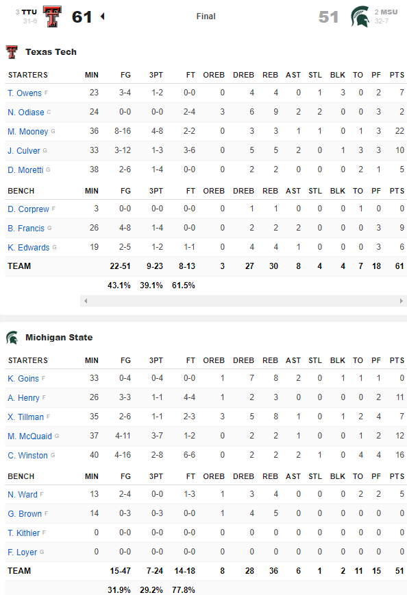 Quant aux Red Raiders, ils ont dominé les Spartans 61-51 avec un super Matt Mooney, qui a inscrit 22 points à 8/16 dont 4/8 à 3-pts. Dans un match comme prévu défensif, les Spartans n’ont pas réussi à se défaire de la défense de leur adversaire, limités à 31.9% dont un 4/16 pour Cassius Winston. Ils ont fini par craquer en seconde mi-temps sous les banderilles de Mooney. ils ont bien réussi à revenir à 1 point grâce à Aaron Henry à 2’55 du buzzer mais derrière ils n’ont plus marqué et Texas Tech a fini sur un 9-0.