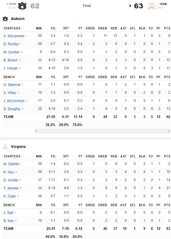 Les Cavaliers de Virginia ont remporté un thriller face à Auburn en l’emportant dans la dernière seconde grâce à 3 lancers-francs de Kyle Guy ! Ce dernier, héros de la soirée, avait planté à 7.6 secondes du buzzer un gros shoot à 3-pts en déséquilibre qui avait mis les siens à un point et mis fin à 5 minutes de disette. Jared Harper a été envoyé sur la ligne des lancers et a rentré une seule de ses tentatives. Derrière Ty Jerome a semblé commettre une reprise de dribble, non sanctionnée. Puis Kyle Guy a été victime d’une faute loin d’être évidente dans le corner et n’a pas tremblé sur la ligne des lancers en rentrant ses 3 lancers.