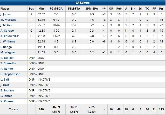 La série de 7 victoires du Jazz a pris fin… chez les Lakers au Staples Center cette nuit, avec un succès 113-109 pour Kentavious Caldwell-Pope (32 points dont 18 dans le dernier quart à 13/22, 6 rebonds, 6 passes) et ses coéquipiers. Avec 10 joueurs disponibles et 8 entrés sur le parquet, les hommes de Luke Walton ont été 5 à signer au moins 10 points. JaVale McGee a terminé à 22 points à 10/16, 8 rebonds, 3 passes et 2 contres, Alex Caruso 18 points à 8/20 et 11 passes.