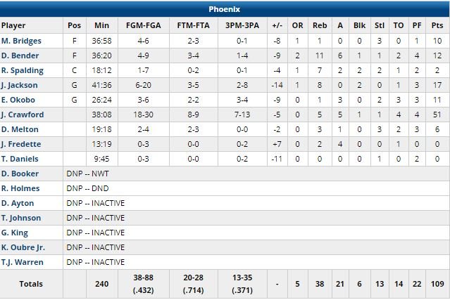 Un au revoir après 21 saisons au sein de la franchise texane qui a éclipsé les 51 points (18/30, 7/13 à 3-points, 5 rebonds, 5 passes) de Jamal Crawford (à un point de son record en carrière, et surtout, qui devient à 39 ans et 20 jours le plus vieux joueur de l’histoire à 50 points, record détenu jusque là par Michael Jordan) pour les Suns (qui jouaient là leur dernier match de la saison) ! Menés de 30 points (68-38) à la pause, Phoenix est revenu à 4 points dans le dernier quart avant deux 3-points consécutifs signés Luka Doncic (21 points à 6/14, 16 rebonds, 11 passes, 8ème triple-double de la saison) et Justin Jackson pour redonner 10 points d’avance aux locaux. Le dernier panier de Nowitzki ? Un fadeaway à un pied dans les 2 dernières minutes.