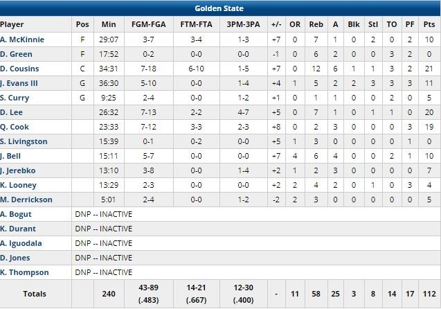 Ce match s’est joué sans Anthony Davis (7ème match manqué pour ‘spasmes au dos’), Kevin Durant (listé comme malade) et Klay Thompson (genou droit douloureux). Après deux premiers quarts-temps disputés (56 partout à la pause), les Warriors ont fait la différence grâce à un 32-23 infligé aux Pelicans dans le 3ème quart-temps. Damion Lee, two-way contract ayant passé la plus grande partie de sa saison en G-League, a battu son record en carrière avec 20 points. Ex-Pelican, Quinn Cook a lui signé 19 points.
