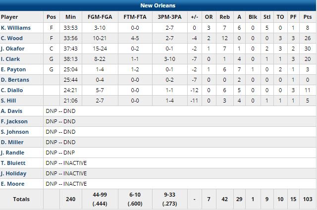 Christian Wood a signé 26 points et 12 rebonds pour les Pelicans (13ème défaite en 16 matchs), Jahlil Okafor 30 points et Ian Clark 20.