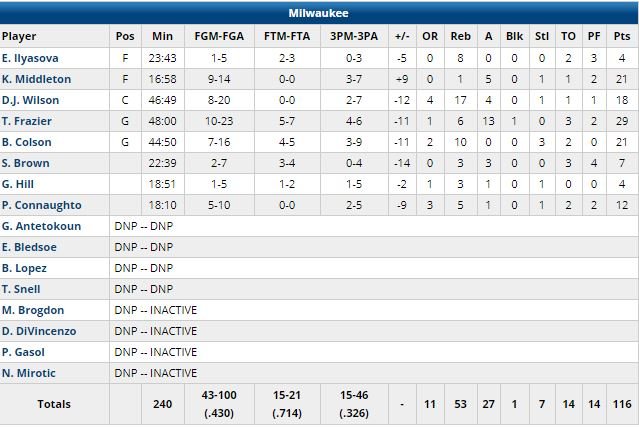 OKC a pris jusqu’à 20 points d’avance dans ce match et a fait la différence dans le 2ème quart-temps, dominé 39-27. Déjà sûr de terminer à la 1ère place, Milwaukee n’a joué qu’avec un seul titulaire habituel : Khris Middleton. Il a terminé à 21 points en 17 minutes de jeu alors que son coéquipier Tim Frazier a battu son record en carrière avec 29 points, tout comme D.J. Wilson avec ses 18 unités (et 17 rebonds !). Le rookie Bonzie Colson a lui signé 21 points.