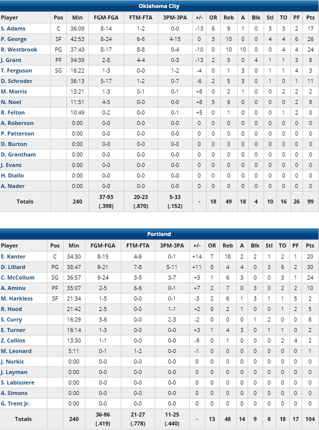 Steven Adams a raté sa tentative et Al-Farouq Aminu a rentré deux lancers, auxquels Westbrook a répondu par deux autres, 98-94 avec 76 secondes au chrono. La possession suivante à plié le match. Mal gérée part Portland, ces derniers ont eu le rebond offensif, ont raté leur shoot et le ballon a été récupéré par Westbrook, mais après un cafouillage, Lillard s’en est emparé. En sortie de temps mort Kanter a plié le match sur un layup, 100-94. Le 3-pts de George est arrivé trop tard.