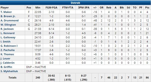 Sans son coéquipier All-Star Blake Griffin (genou gauche douloureux), Andre Drummond (12 points à 4/9, 12 rebonds, 2 passes) a fini par se frustrer : son équipe menée de 41 points, il a poussé Antetokounmpo par terre alors que le Grec venait de s’emparer d’un rebond offensif en fin de 3ème quart-temps et a été éjecté (faute flagrante 2). Drummond avait récupéré la charge de défendre sur Antetokounmpo car Thon Maker, qui avait tenté de le ralentir en début de match, avait des problèmes de fautes. Griffin, en tenue de ville, a écopé d’une technique pour avoir protesté suite à l’exclusion du pivot.