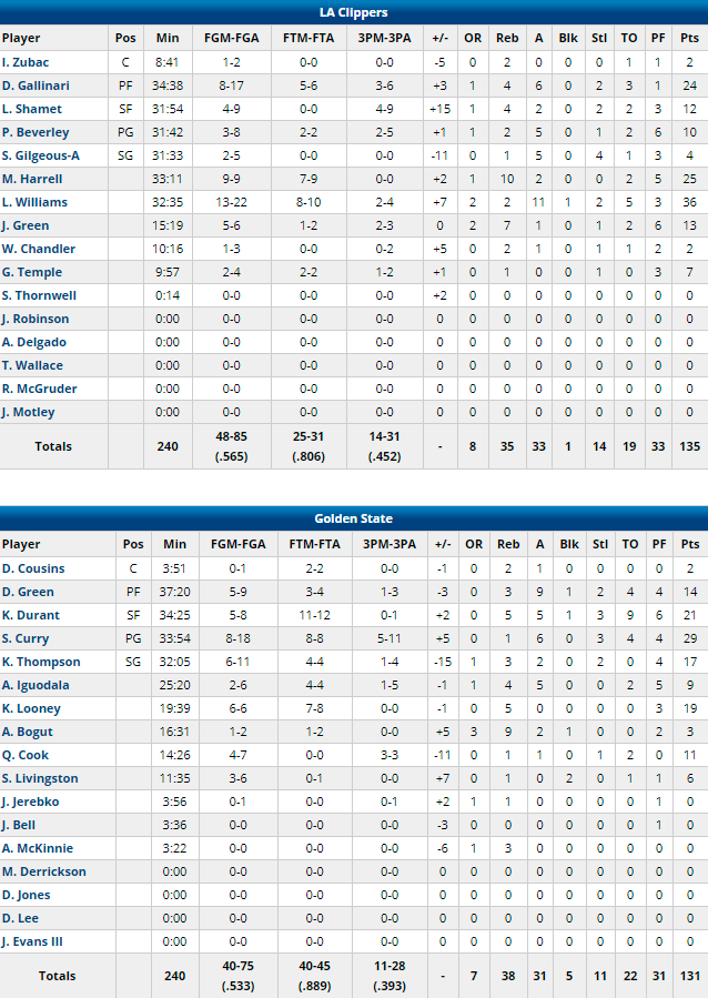 Lou Williams est l’homme du match avec 36 points à 13/22 en sortie de banc et des paniers clutchs à foison. Montrezl Harrell n’est pas en reste avec 25 points à 9/9 et 10 rebonds alors que Danilo Gallinari ajoute lui 24 points à 8/17. Les hommes de Doc Rivers ont réalisé une énorme prestation offensive en seconde mi-temps avec 85 points dont 41 en dernier quart. Ils shootent à 56.5% dont un 14/31 derrière l’arc. En face la défense des Warriors a failli, incapable de ralentir l’adversaire. Stephen Curry inscrit 29 points à 8/11 dont 5/11 à 3-pts et 6 passes alors que Kevin Durant inscrit 21 points à 5/8 mais n’a pas joué les dernières secondes, sorti pour 6 fautes. Golden State s’incline en shootant à 53.3% mais perd 22 ballons.