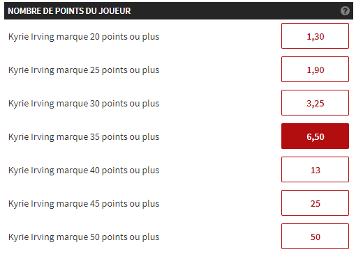 En vous inscrivant ici chez notre partenaire Winamax votre premier pari est remboursé à hauteur de 100€, pourquoi ne pas en profiter pour flamber un peu puisque vous ne risquez rien. Ce soir les cotes des matchs sont peu intéressantes, on vous propose donc de se pencher plutôt sur les performances individuelles, et notamment celle de Kyrie Irving. Excellent lors du Game 2, une grosse performance de Boston à l’extérieur, dans une ambiance hostile, passera sans doute par une grosse performance du meneur. Et on le voit bien rester en mode playoffs et frapper un grand coup dans cette série pour porter les siens. Personne ne peut vraiment le stopper du côté d’Indiana et on mise sur un match à au moins 35 points.