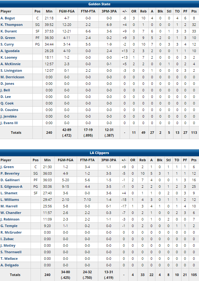 Klay Thompson (32 points à 12/20 dont 6/9 à 3-pts) et Kevin Durant (33 points à 12/21 dont 3/6 à 3-pts, 7 rebonds et 6 passes) sont les deux meilleurs Warriors et ils ont parfaitement compensé la soirée très très difficile de Stephen Curry, limité à 12 points à 3/14 dont 1/9 à 3-pts, mais 10 rebonds, 7 passes et 2 interceptions. Andre Iguodala a été précieux avec 10 points à 4/10 tout comme Draymond Green avec 10 points à 4/11, 9 rebonds et 5 passes . Les Warriors shootent à 47.2% dont un 12/31 à 3-pts. Après avoir perdu beaucoup de ballons lors des 30 premières minutes, ils les ont ensuite bien limités (13 sur le match) pour finir fort. En face les Clippers rentrent seulement 42.5% de leurs tirs malgré un bon 13/31 à 3-pts. Le rookie Shai-Gilgeous Alexander est le meilleur Clipper puisqu’il signe son record en carrière avec 25 points à 9/15 dont 3/5 à 3-pts. Lou Williams (12 points à 2/10) et Danilo Gallinari (16 points à 5/20) passent eux totalement à côté en combinant un terrible 7/30 aux tirs.