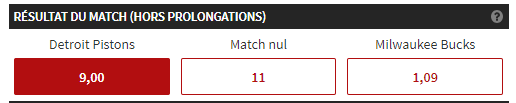 En vous inscrivant ici chez notre partenaire Winamax votre premier pari est remboursé à hauteur de 100€, pourquoi ne pas en profiter pour flamber un peu puisque vous ne risquez rien. Ce soir, pas de performance individuelle mais c’est bien un conseil sur l’issue d’un match qu’on vous propose, plus particulièrement celui entre les Pistons et les Bucks. Au vu des 3 premiers matchs les Bucks sont largement favoris ce soir mais la côte est incroyablement basse : 1.09 ! Dos au mur et chez eux, les Pistons sont capables, si toutes les planètes sont alignées – notamment avec de grandes performances de leur trio Blake griffin, Andre Drummond et Reggie Jackson – de battre les Bucks si ces derniers sont dans un jour sans.