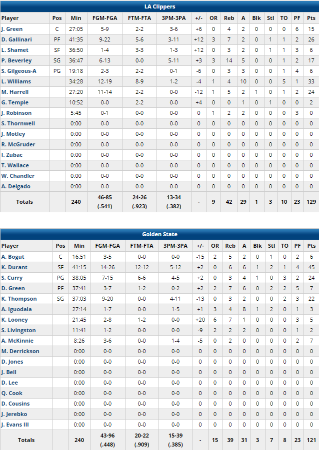 Lou Williams est l’homme du match, auteur de 33 points à 12/19 et 10 passes dont 11 points dans le dernier quart et 9 de suite dans le money time dont un énorme 3+1. Il a été superbement aidé par son acolyte du banc Montrezl Harrell, qui compile 24 points à 11/14 et 5 rebonds. Danilo Gallinari s’est lui enfin réveillé et signe 26 points à 9/22 dont 3/11 à 3-pts et 7 rebonds. Pat Beverley (17 points à 5/11 à 3-pts) et JaMychal Green (15 points à 3/6 à 3-pts) ont été très précieux. Ils shootent sur le match à un superbe 54.1% dont 13/34 à 3-pts en perdant seulement 10 ballons. Ils ont résisté à l’énorme match de Kevin Durant, auteur de 45 points à 14/26 dont 5/12 à 3-pts, mais hormis Stephen Curry (24 points à 7/15 dont 4/5 à 3-pts) et Klay Thompson (22 points à 9/20 dont 4/11 à 3-pts), KD a manqué d’aide. Les champions en titre shootent à seulement 44.8% dont un 15/39 à 3-pts.