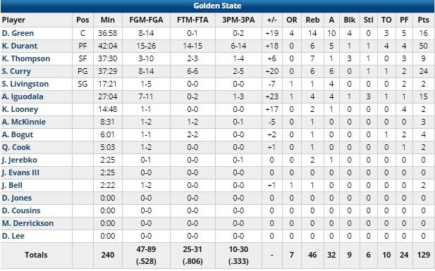 Draymond Green était lui en triple-double avec 16 points à 8/14, 14 rebonds, 10 passes et 4 contres alors que Stephen Curry a terminé à 24 points à 8/14, 6 rebonds et 6 passes. En face Danilo Gallinari a fini meilleur marqueur des Clippers avec 29 points à 11/24, devant le rookie Shai Gilgeous-Alexander, 22 points à 8/14, 5 rebonds et 6 passes.