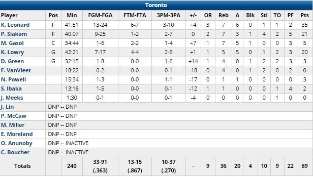Greg Monroe (10 points à 4/7 et 5 rebonds en 11 minutes) est sorti dans le 3ème quart à cause d’une douleur au genou et n’est pas revenu en jeu pour Philadelphie. Les Sixers (avantage 53-36 au rebond) ont perdu 20 ballons (pour 24 points adverses). Leonard shooté à 6/10 en 1ère mi-temps, le reste de son équipe à 9/36. Toronto a été tenu à 36.3% aux tirs. Ben Simmons a terminé à 6 points à 3/6, 7 rebonds et 5 passes en 44 minutes.