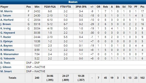 Auteur de 26 points et 11 passes dans le Game 1, Kyrie Irving a été limité à 9 points à 4/18 aux tirs. Pat Connaughton a contribué à la domination de Milwaukee au rebond (54-45) avec 11 prises. Middleton a rentré 7 des 20 tirs à 3-points de son équipe. L’équipe a davantage switché sur les écrans dans ce Game 2 et a tenu Boston à 39.5% de réussite. Titulaire à la place de Sterling Brown (en difficulté dans le Game 1 et souffrant en plus du dos), Nikola Mirotic (9 points et 9 rebonds en 25 minutes) a pris 2 fautes rapides en défendant sur Jaylen Brown et a vite été remplacé par Connaughton.