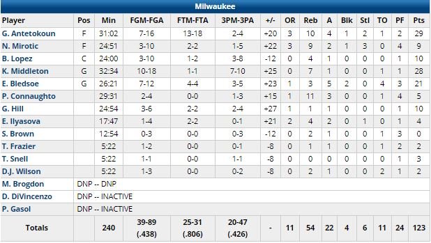 Le trio Giannis Antetokounmpo (29 points à 7/16, 13/18 aux lancers-francs, 10 rebonds, 4 passes, 2 interceptions) – Khris Middleton (28 points à 10/18 et 7 rebonds) – Eric Bledsoe (21 points à 7/12, 3 rebonds, 5 passes et 2 contres) a été particulièrement efficaces. L’équipe a établi un nouveau record de franchise (en playoffs) à 3-points avec 20 réussites longue distance (20/47 contre 10/28 pour les Celtics) et a pris jusqu’à 31 points d’avance en seconde mi-temps.