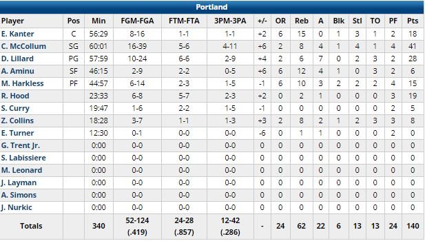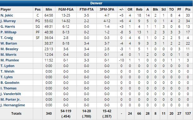 Mais le meilleur Blazer a été CJ McCollum, auteur de 41 points à 16/39 dont 4/11 à 3-pts, 8 rebonds, 4 passes, 4 interceptions en 60 minutes ! Damian Lillard n’est pas en reste avec 28 points à 10/24 dont 2/9 à 3-pts et 8 passes alors qu‘Enes Kanter compile 18 points à 8/16 et Moe Harkless 15 points à 6/14. Les Blazers (devant 48-47 à la pause et 81-76 à l’entame du dernier quart, remporté 26-21 par Denver) shoootent à un petit 41.9% sur la rencontre, mais rentrent 24 lancers, prennent 24 rebonds offensifs et surtout ne perdent que 13 ballons en 68 minutes. Côté Denver Nikola Jokic, qui a raté un lancer pour égaliser dans les dernières secondes de la 4ème prolongation compile 33 points à 13/25 dont 4/7 à 3-pts, 18 rebonds, 14 passes et 8 ballons perdus en 65 minutes. Jamal Murray ajoute 34 points à 14/32 dont 4/12 à 3-pts et 9 rebonds tandis que Will Barton score 22 points en sortie de banc et Paul Millsap 17 points. Les Nuggets paient leurs 20 ballons perdus et leur petit 14/20 sur la ligne des lancers.