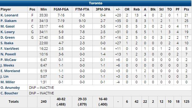 En tête d’un point (27-26) au terme du 1er quart-temps, les hommes de Nick Nurse ont dominé le 2ème 37-17 et pris une avance de 21 points à la mi-temps, 64-43. Après avoir entamé le dernier quart en tête 92-70, l’équipe (16/40 à 3-points, record de 3-points dans un match de playoffs pour la franchise) est montée jusqu’à +40 sur un dunk de Norman Powell à 2’24 de la fin. Le 4ème quart a été presque aussi dévastateur que le 2ème puisque Philadelphie, porté par les 22 points (6/16, 5 rebonds, 7 passes) de Jimmy Butler et les 15 points (6/12, 6 rebonds) de Tobias Harris, a encaissé un 33-19 sur les 12 dernières minutes.