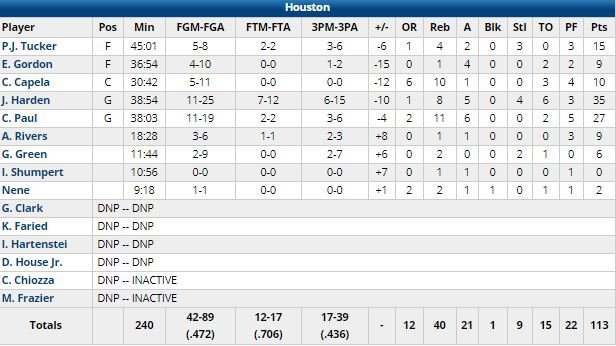 Durant n’avait pas fait le déplacement afin de suivre ses soins dans la Bay Area. Steve Kerr a fait démarrer Andrew Bogut (11 minutes, 0 point, 3 rebonds) à sa place. Le banc des Warriors a apporté 33 points (dont 14 points à 6/8 et 5 rebonds de Looney et 11 points à 4/6 de Livingston), contre 17 pour celui des Rockets. Clint Capela a terminé à 10 points à 5/11 et 10 rebonds, Andre Iguodala lui signé un superbe 5/8 à 3-points pour 17 points au total.