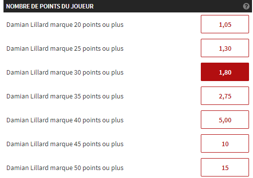 On tente notre second pari sur le match entre les Blazers et les Nuggets. C’est win or go home et dans ce genre de situation, il y a un joueur sur qui normalement on peut compter pour répondre présent : Damian Lillard. Excellent lors du Game 5 on le voit bien réaliser un gros Game 6 peu importe l’issue et notamment passer la barre des 30 points.