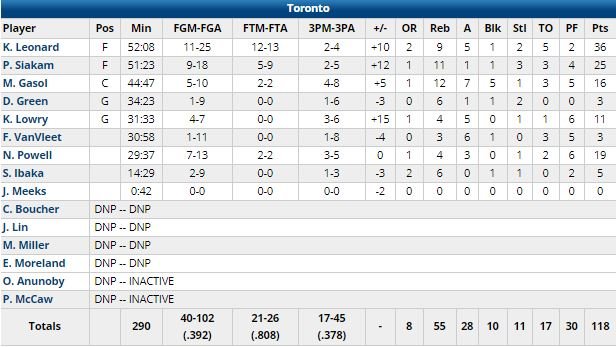 À leurs côtés Norman Powell (sorti pour 6 fautes, comme Kyle Lowry, dans le 4ème quart-temps) et Marc Gasol ont respectivement ajouté 19 points et 16 points et 12 rebonds. Giannis Antetokounmpo est lui sorti pour 6 fautes à 4’24 de la fin de la seconde prolongation, et a été limité à 12 points à 5/16 mais 23 rebonds, 7 passes et 4 contres. George Hill a terminé à 24 points et Malcolm Brogdon 20 dans cette première défaite à l’extérieur pour Milwaukee dans ces playoffs. Siakam s’est rattrapé en venant contrer un potentiel tir de la gagne de Brook Lopez à 43 secondes de la fin de la 2ème prolongation. Derrière, Leonard a pu trouver un layup et donner 4 points d’avance aux Raptors à 30 secondes du buzzer.