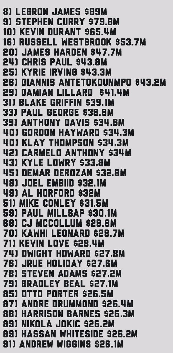 Forbes vient de sortir son classement des sportifs les mieux payés lors de l’année écoulée (juin 20018 à juin 2019) et sans surprise on retrouve énormément de NBAers dans le Top 100. Ils sont pas moins de 34, le sport le mieux représenté, toutefois aucun n’arrive sur le podium puisque LeBron James, le mieux classé, est en 8ème position. Ce sont les footballeurs Lionel Messi, Cristiano Ronaldo et Neymar arrivent aux 3 premières places. Stephen Curry et Kevin Durant sont également dans le Top 10.