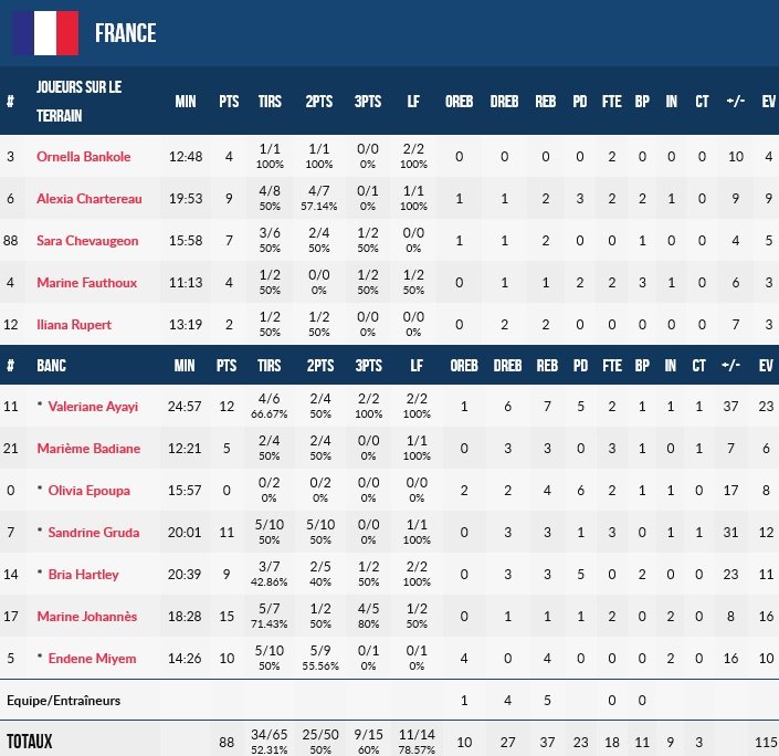 Marine Johannès est la meilleure marqueuse du match avec 15 points à 4/5 à 3-pts. Valériane Ayayi termine avec 12 points à 2/2 à 3-pts, 7 rebonds, 5 passes, 1 interception et 1 contre, Sandrine Gruda ajoute 11 points alors qu’Endy Miyem score 10 points.