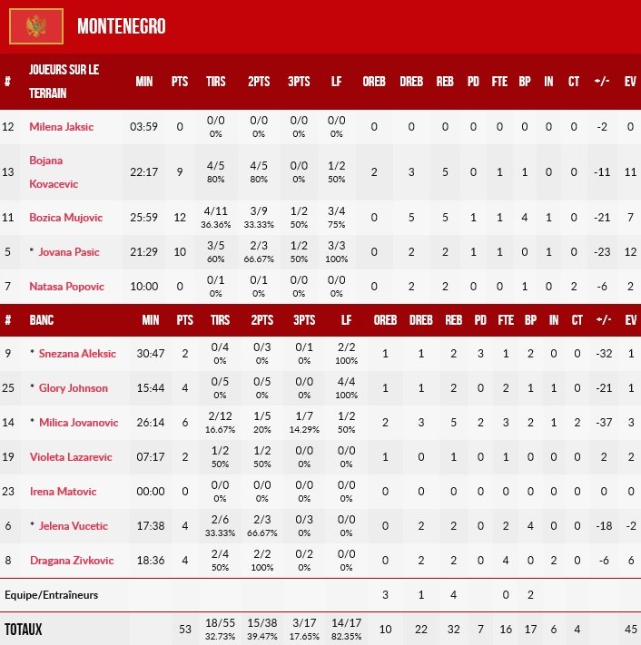Sous l’impulsion de Mujovic et grâce à une belle adresse, le Monténégro a continué sur sa lancée de la fin du premier quart pour revenir à 6 points, 26-20. Run stoppé par une avalanche de shoots à 3-pts signés Johannès, Ayayi et Bria Hartley pour un 11-2, 37-22. Énorme des deux côtés du terrain,Sandrine Gruda a permis aux siennes de s’envoler encore plus pour mener 46-25 après 20 minutes avec un superbe 5/6 derrière l’arc.