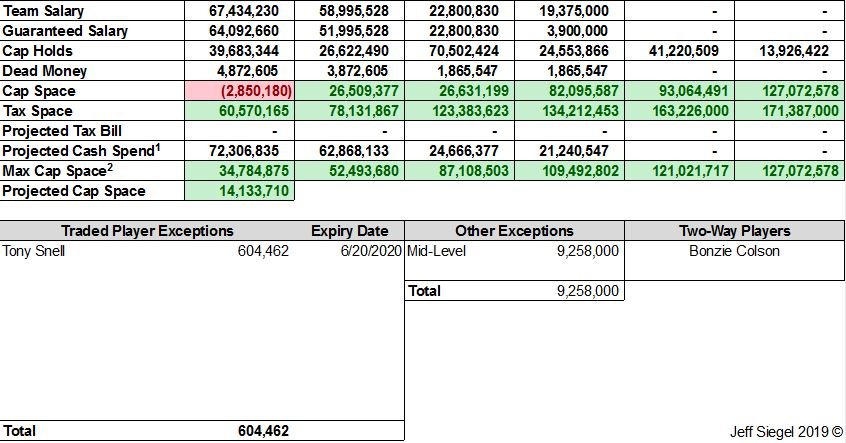 - les salaires engagés, c’est-à-dire le total des salaires des joueurs sous contrat pour l’année prochaine, plus le montant du contrat des futurs rookies. Sur le tableau ci-dessous ce sont les joueurs dont le salaire n’est pas surligné pour 2018-19