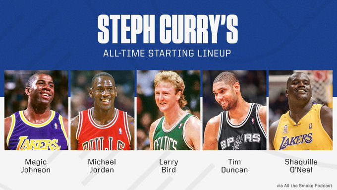 Steph Curry gives his All-Time starting 5: Magic, Larry Bird, MJ, Shaq & Tim Duncan pic.twitter.com/rzHYjeVROf