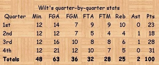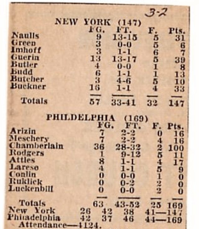 Le 2 mars 1962 Wilt Chamberlain réalisait une des plus grandes performances de l’histoire du sport en inscrivant pas moins de 100 points lors de la victoire des Philadelphia Warriors sur les New York Knicks. Depuis personne ne s’est véritablement approché de ce record (Kobe Bryant est arrivé à 81), qui n’est pas près d’être battu. Ce jour-là le Warrior a signé 100 points à 36/63 et 28/32 sur la ligne des lancers, 25 rebonds, 2 passes et 2 fautes en 48 minutes. Voilà la feuille de match de la victoire de la franchise de Pennsylvanie sur le score de 169-147 :