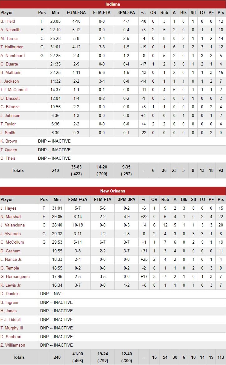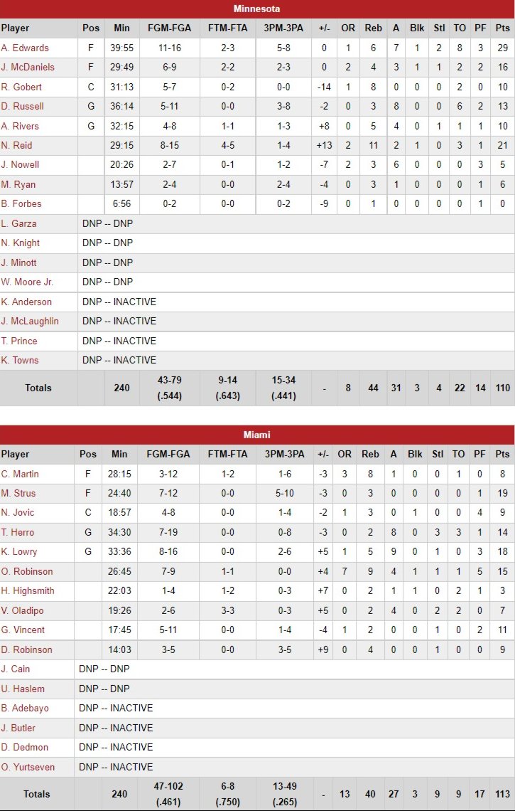 Sans Jimmy Butler et Bam Adebayo, Miami a réussi à s’imposer face aux Wolves d’Anthony Edwards (29 points), porté par les 19 points de Max Strus et les 18 points et 9 passes de Kyle Lowry. Les Floridiens reviennent à l’équilibre (17-17). Rudy Gobert termine à 10 points à 5/7 et 8 rebonds. De leur côté sans Zion et Ingram, les Pelicans de Naji Marshall (22 points, record en carrière), Jonas Valanciunas (20 points, 12 rebonds) et C.J. McCollum (19 points) ont dominé les Pacers de 20 points.