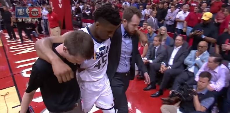 Donovan Mitchell a dû quitter ses coéquipiers suite à une blessure au pied gauche en fin de Game 5 :