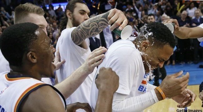 Russell Westbrook a fini son match en beauté avec ce shoot sur la tête de Tony Allen, qui a offert